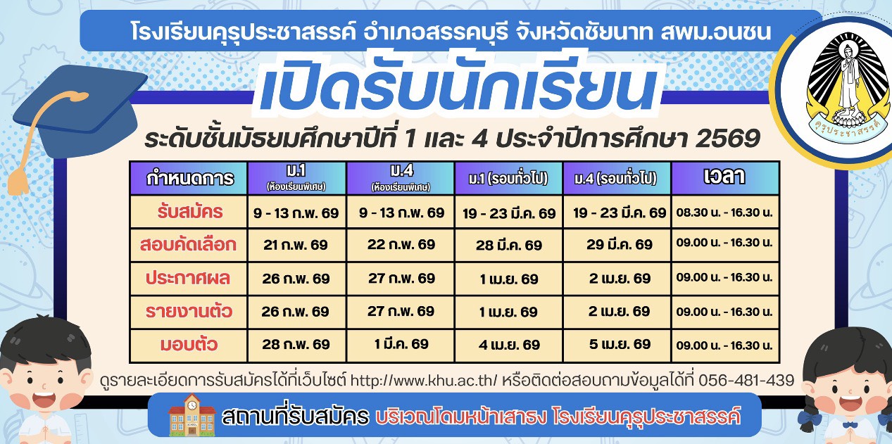 ประกาศโรงเรียนคุรุประชาสรรค์ เรื่อง นักเรียนที่มีคุณสมบัติเข้ารับการสอบคัดเลือกศึกษาต่อ ชั้นมัธยมศึกษาปีที่ 1 และ ชั้นมัธยมศึกษาปีที่ 4 (รอบทั่วไป) ปีการศึกษา 2569